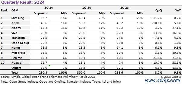 8月3日,根据最新的Omdia智能手机出货预调研报告,2024年第二季度出货量总计2.903亿台。与上一年相比,同比增长9.3%,环比下降了3.2%。此前两个季度的同比增长率分别是11.5%和9.3%在1Q24和4Q23。许多智能手机品牌在该季度获得了两位数的增长,如小米股票杠杆配资开户,vivo,摩托罗拉和华为。传音和Apple增长温和,传音在此前实现了3位数的增长,现在增长率仅为4.1%。